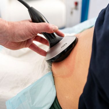 Eine Ausnahme bildet die Behandlung von Köperzonen mit festerer Bindegewebsstruktur. Beispiele hierfür sind die Außenseiten der Schenkel oder die sogenannten „Reiterhosen“. Hier wird das entsprechende Areal ohne Vakuum mittels eines patentierten Plattenapplikators großflächig behandelt.